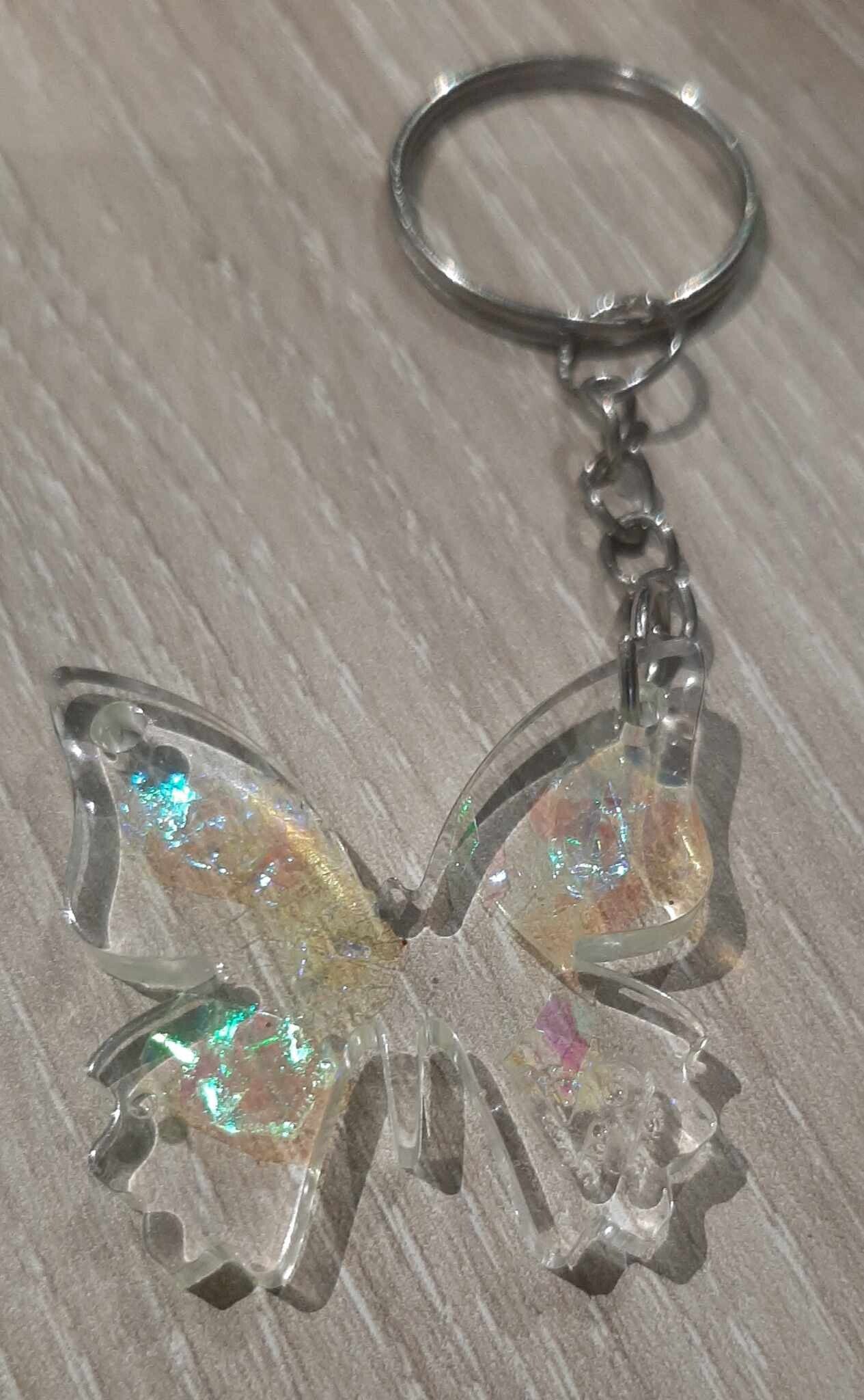 Porte clefs papillon en résine. Environ 3cm x 3cm. Translucide avec des flocons holographiques jaune vert.En bas d'une aile se trouve , soit un signe du zodiaque, soit un chiffre ou rien