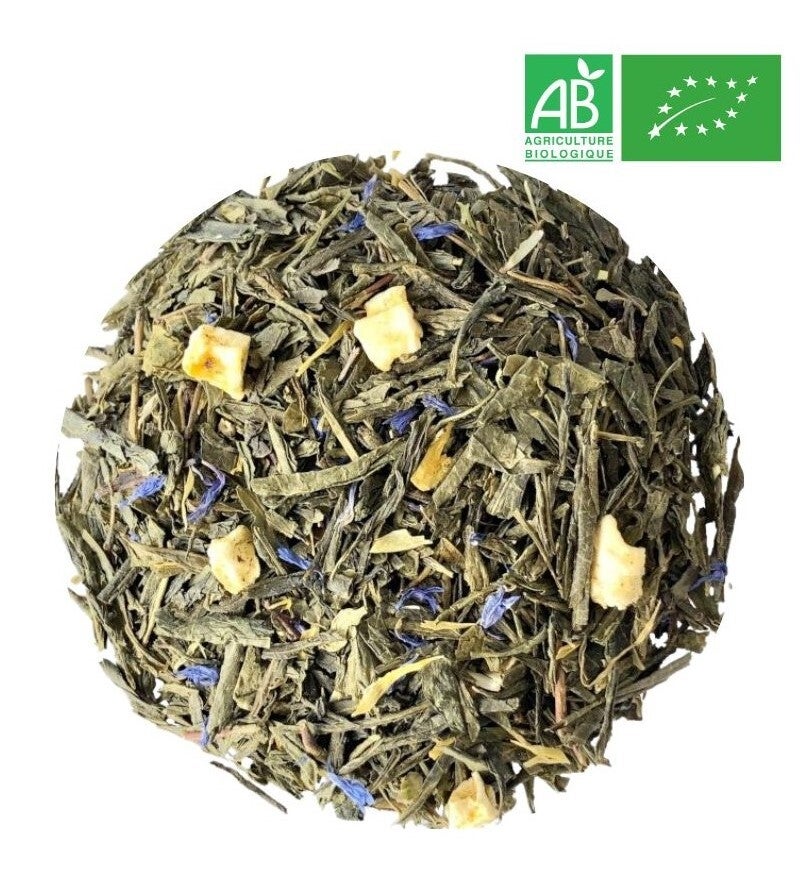 thé vert , bergamote, mangue séchés, fleurs de souci, fleurs de bleuet. Issus de l'agriculture biologique.