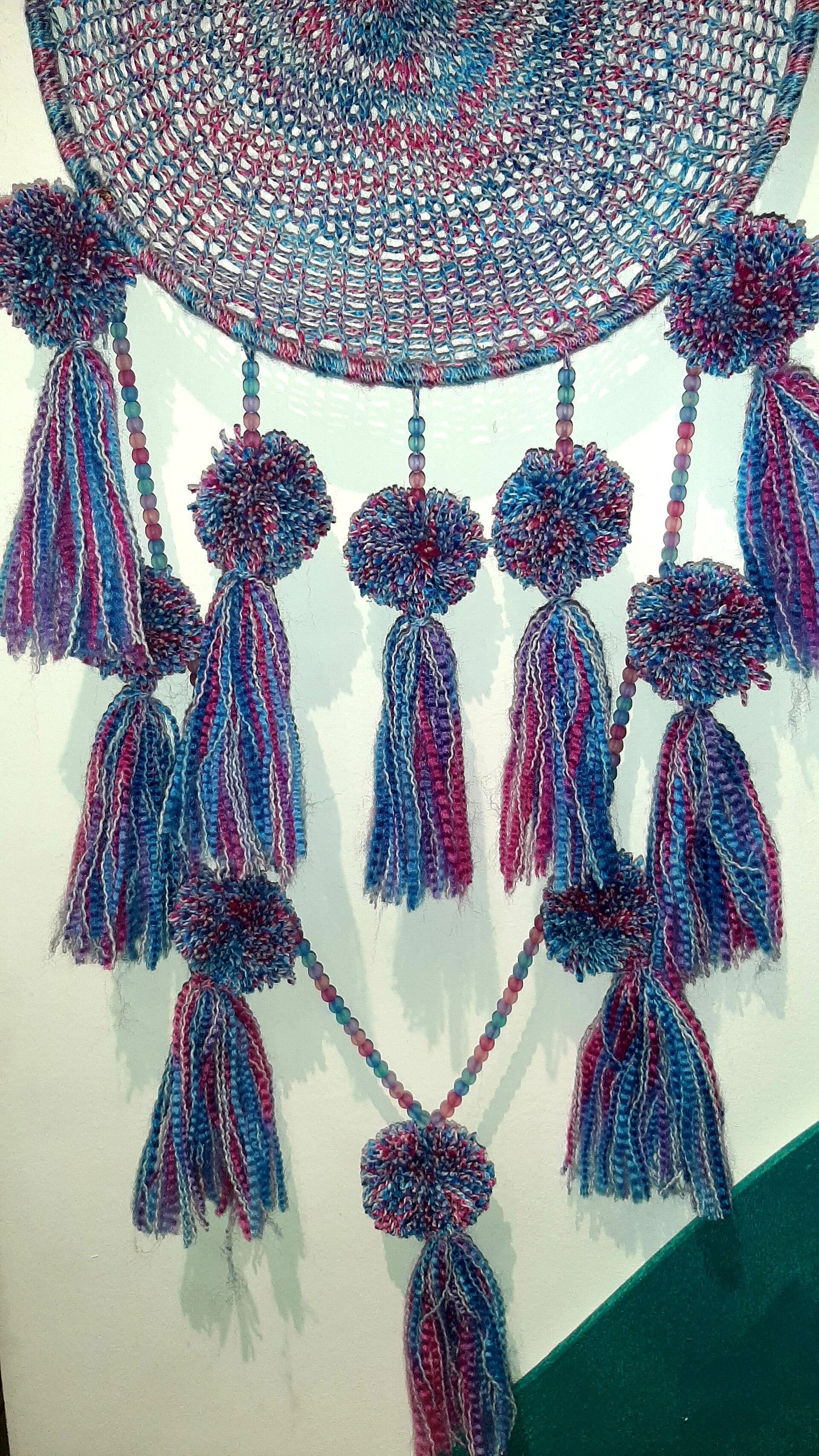 Attrape rêves fait main . Couleur violet rose bleu. Cercle de 26 cm. Hauteur 79cm .