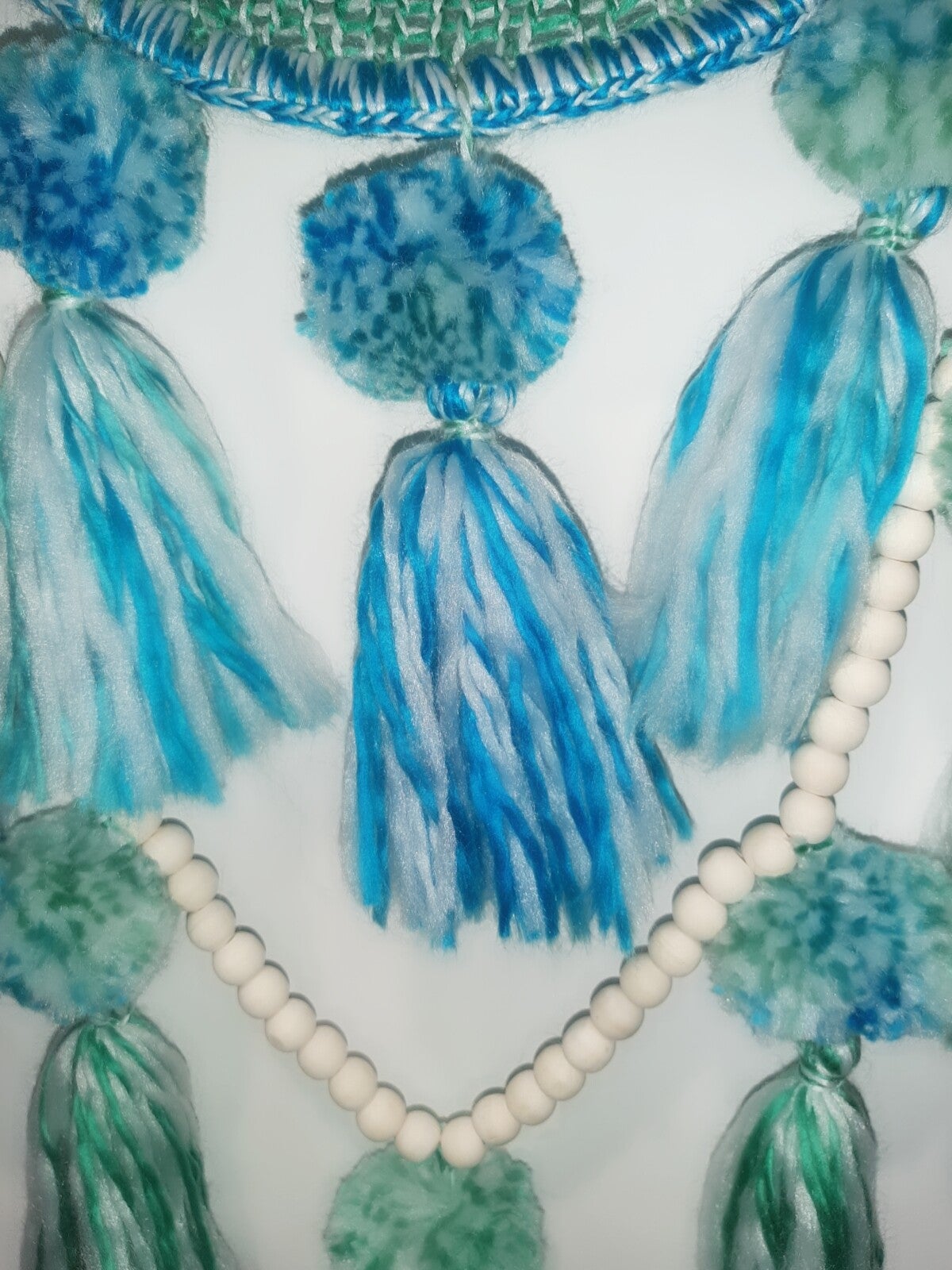 Attrape rêves fait main. Couleur bleu vert. Cercle de 26 cm. Hauteur 73 cm