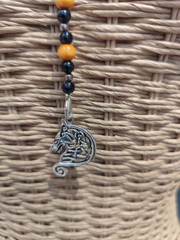 Ce collier est composé de perles en bois, acryliques et métal. Une perle intercalaire argenté représentant un arbre de vie. Un mousqueton fini ce collier avec un pendentif loup celtique. L'originalité de ce collier c'est qu'on peut changer le pendentif comme on le souhaite.