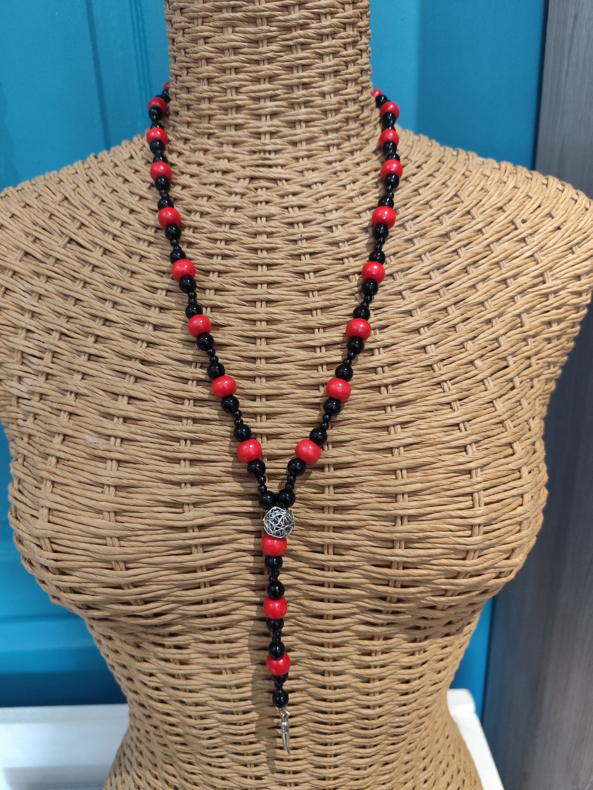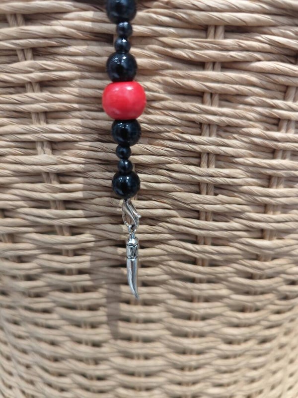 Ce collier est composé de perles en bois, acryliques et métal. A son extrémité je lui ai mis un crochet mousqueton afin que vous puissiez changer le pendentif comme bon il vous semble. Celui ci est habillé d'une corne