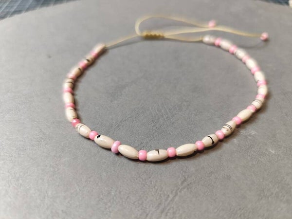 Bracelet de cheville composé de perles acryliques. Réglage avec son nœud coulissant