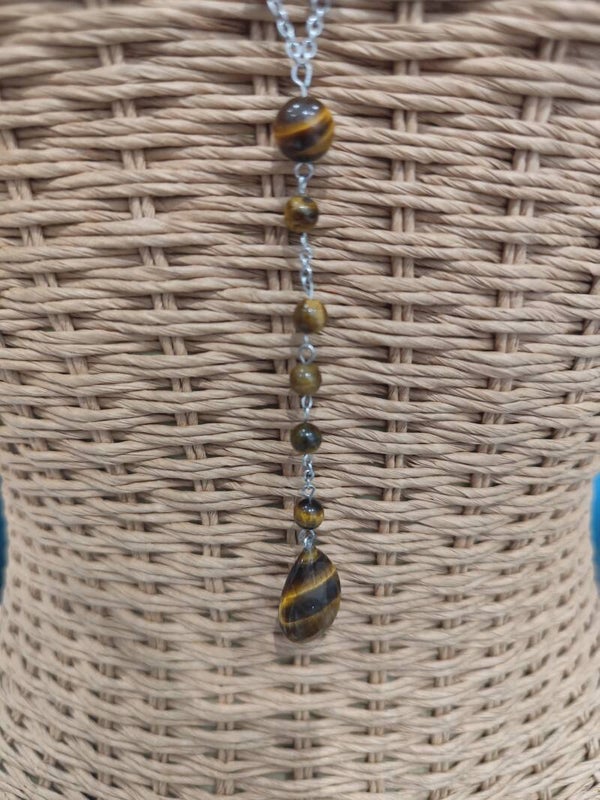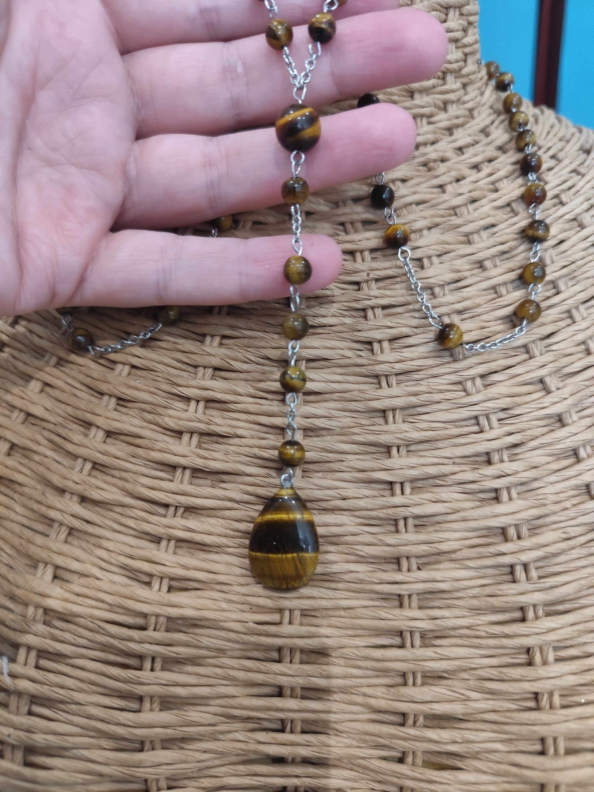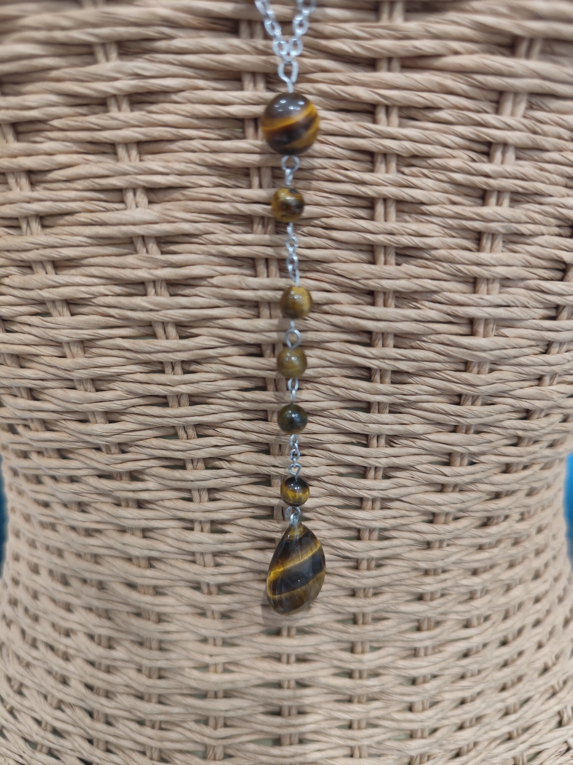 Collier Harmonie inspiré du chapelet en pierre oeil de tigre. Composé de 59 perles 6 mm œil de tigre, 1 perle connecteur œil de tigre, chaine acier et un pendentif en œil de tigre