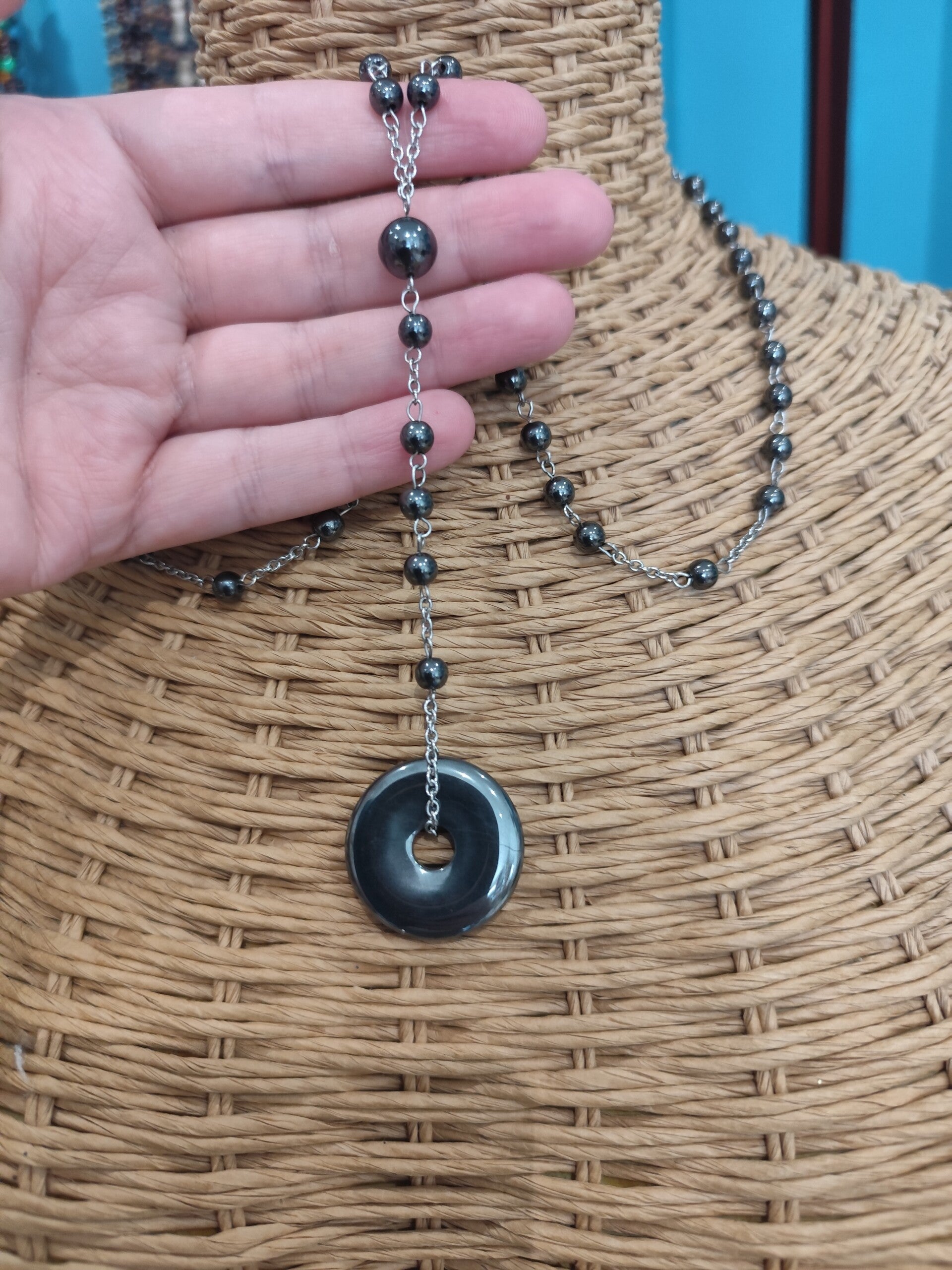 Collier Harmonie inspiré du chapelet en pierre hématite. Composé de 59 perles 6 mm en hématite. 1 perle connecteur en hématite, chaîne acier et un pendentif Donuts en hématite