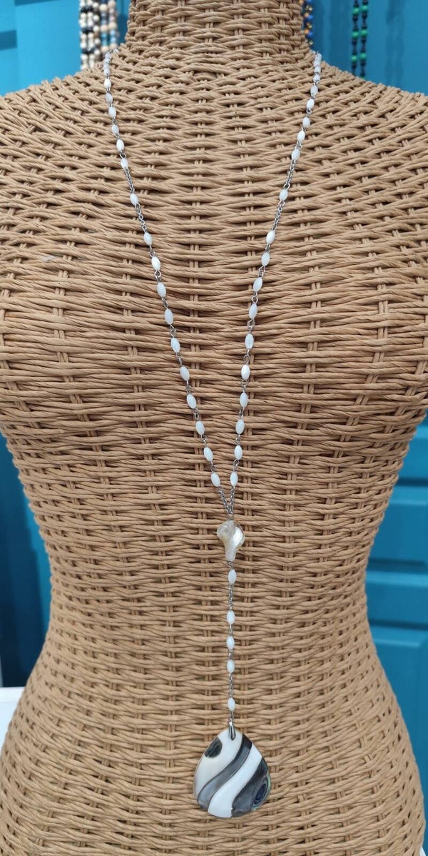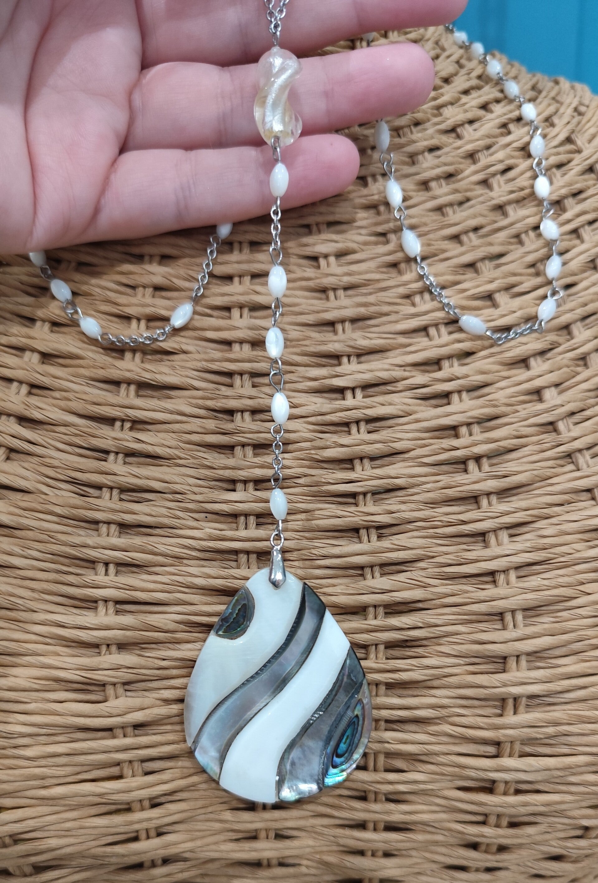 Collier Harmonie inspiré du chapelet en coquillages nacre et abalone. Composé de 59 perles coquillages, d'acier et d'un pendentif en nacre et abalone