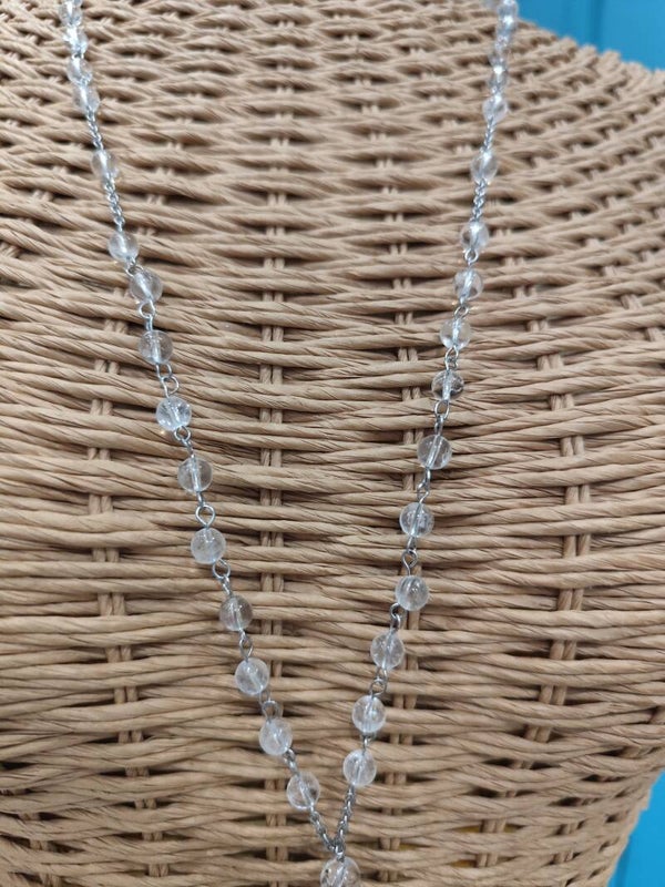 Collier Harmonie inspiré du chapelet en pierre cristal de roche. Composé de 59 perles de cristal de roche, 1 perle connecteur cristal de roche et 1 pendentif Donuts en cristal de roche. Chaine acier